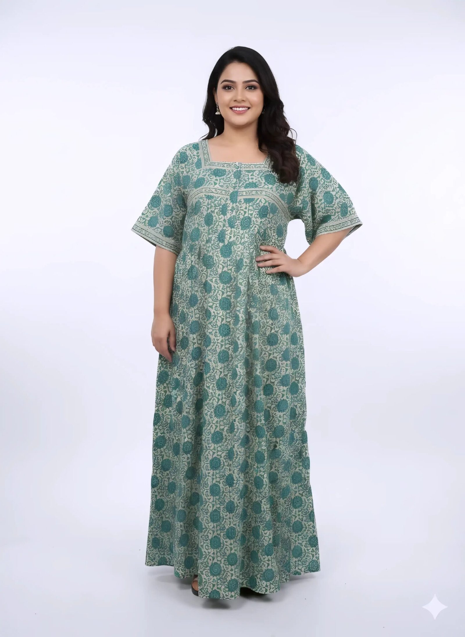 Enhance your relaxation experience with our 3 Button Plus Size Nighty, perfectly tailored for those seeking both comfort and style. This nighty is designed to fit beautifully for a chest size of 58-60 inches and a length of 59 inches, ensuring a relaxed and graceful silhouette. Crafted from high-quality cotton fabric, it offers unmatched breathability and softness. The contrasting piping details elevate its aesthetic, while the classic round neckline and short sleeves provide effortless ease. With a length that flows elegantly, this nighty combines functionality with sophistication, making it an ideal choice for cozy evenings and restful nights.