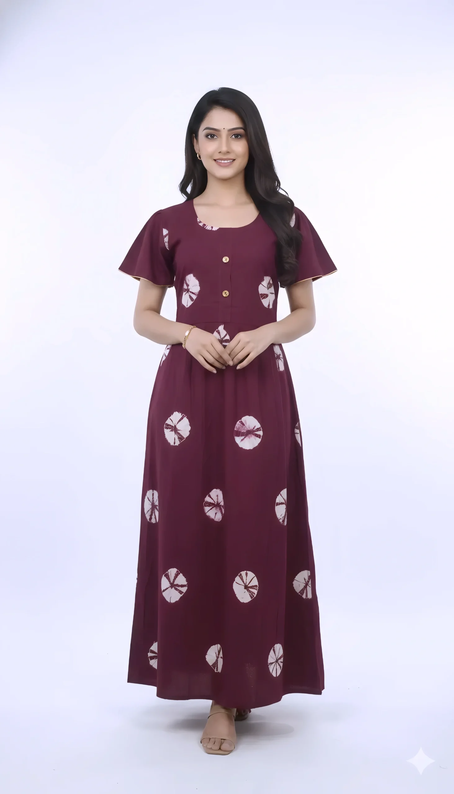 Discover elegance and comfort with our Batiq Frock Nighty, made from soft cotton with a graceful frock-style design for a chic bedtime look.