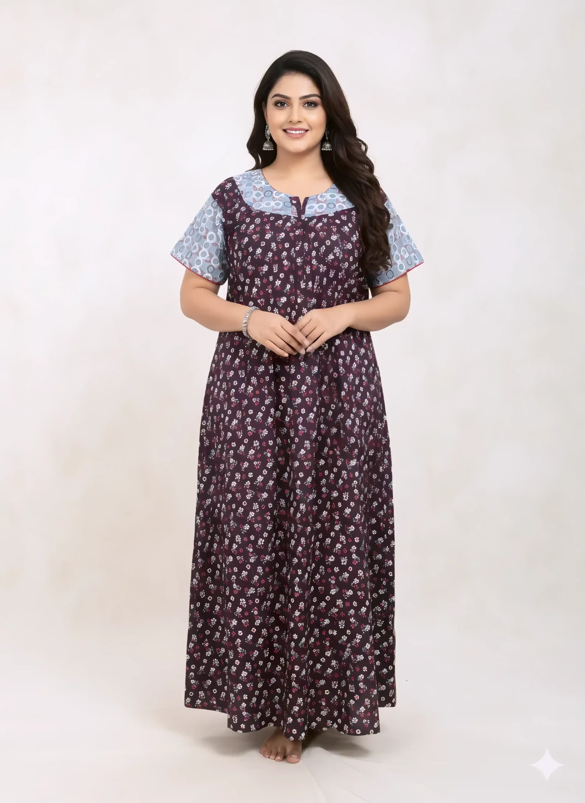 The Centre Zip Nighty, designed for a chest size of 48-50 inches and a height of 54-55 inches, combines functionality and style to ensure maximum comfort. Crafted from premium cotton, it offers a soft, breathable texture that feels gentle on the skin, perfect for relaxation or restful sleep. The nighty’s central zip, extending 9 inches, adds a touch of convenience for easy wear and nursing functionality if needed. Its well-tailored design ensures a flattering silhouette with ample room for movement. The short sleeves and modest round neckline enhance its appeal, making it a practical yet stylish choice for diverse body types.