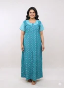 The Centre Zip Nighty, designed for a chest size of 48-50 inches and a height of 54-55 inches, combines functionality and style to ensure maximum comfort. Crafted from premium cotton, it offers a soft, breathable texture that feels gentle on the skin, perfect for relaxation or restful sleep. The nighty’s central zip, extending 9 inches, adds a touch of convenience for easy wear and nursing functionality if needed. Its well-tailored design ensures a flattering silhouette with ample room for movement. The short sleeves and modest round neckline enhance its appeal, making it a practical yet stylish choice for diverse body types.