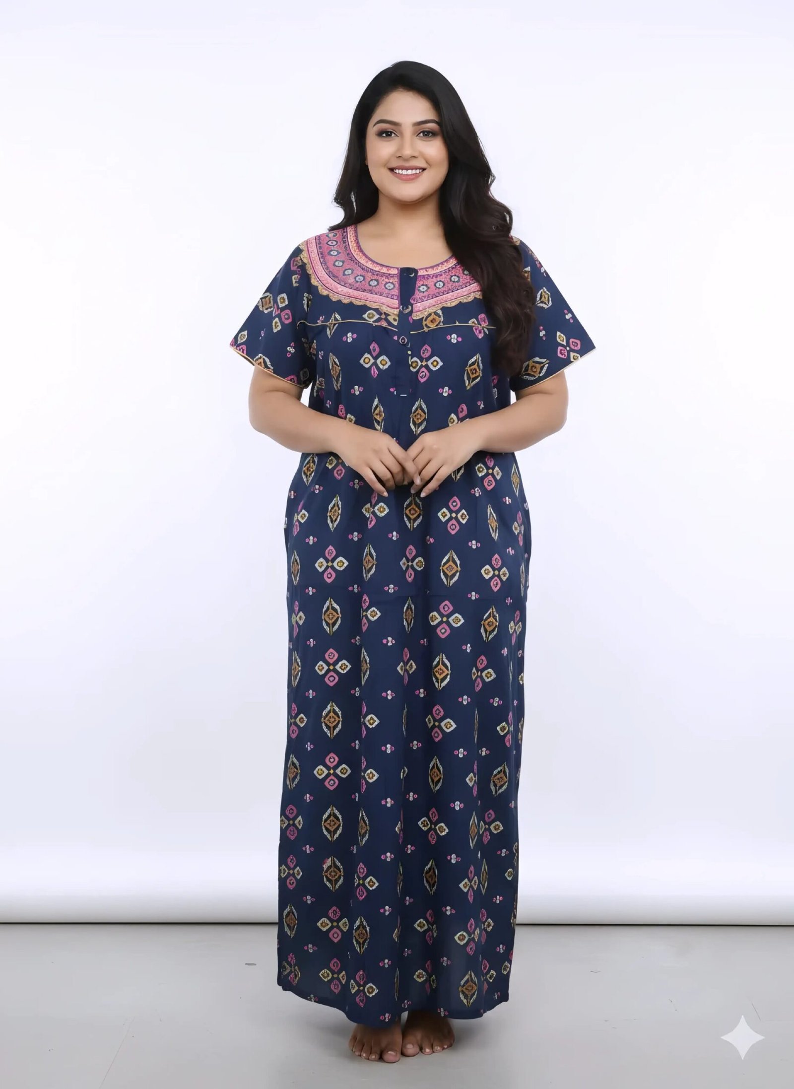 Elevate your nighttime elegance with our Embroidered Neck Nighty, designed to combine style and comfort effortlessly. Made from premium, breathable fabric, this nighty features exquisite embroidery work adorning the neckline, adding a touch of sophistication to your sleepwear. The round neck and short sleeves provide a relaxed fit, while the flowing silhouette flatters every body type.