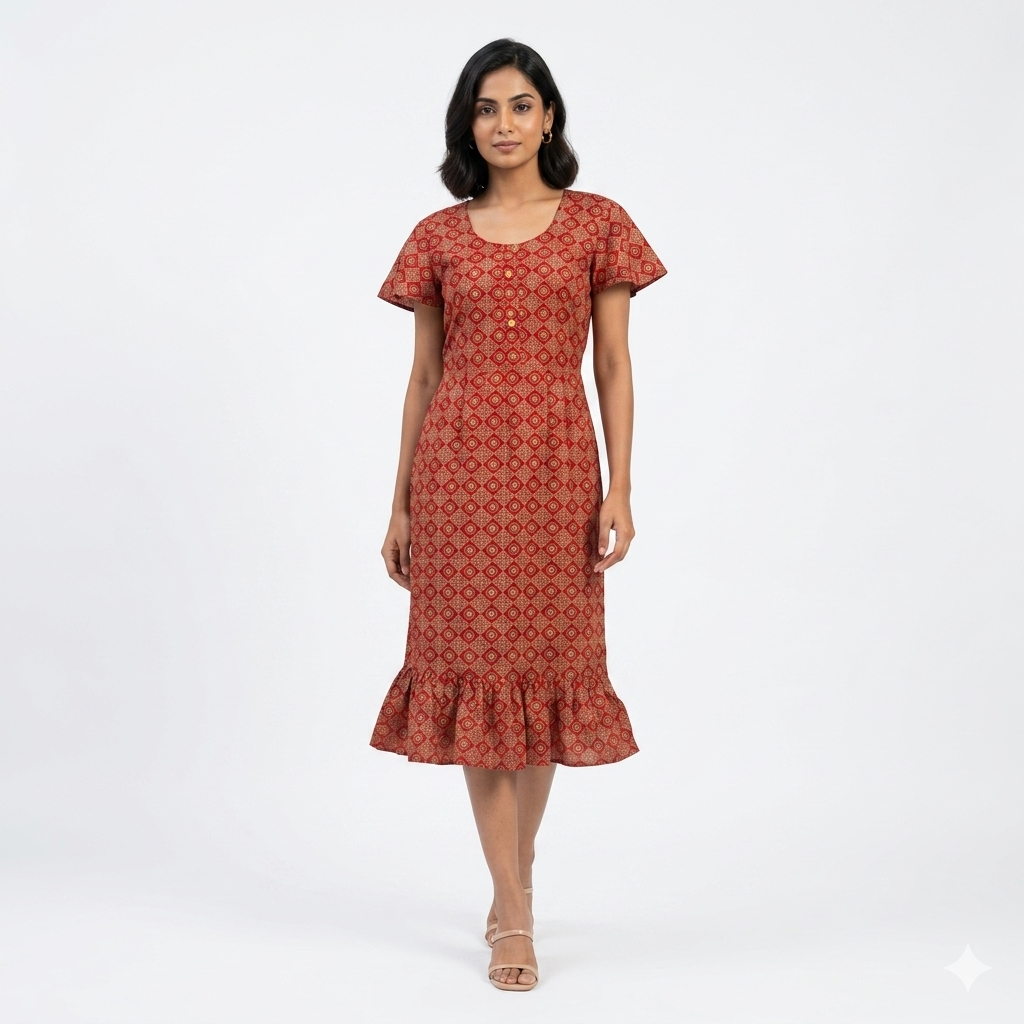 Fabric & Fit: Made from soft, breathable cotton, it boasts a frock-style silhouette with a round neckline and short sleeves, offering a relaxed yet stylish look.