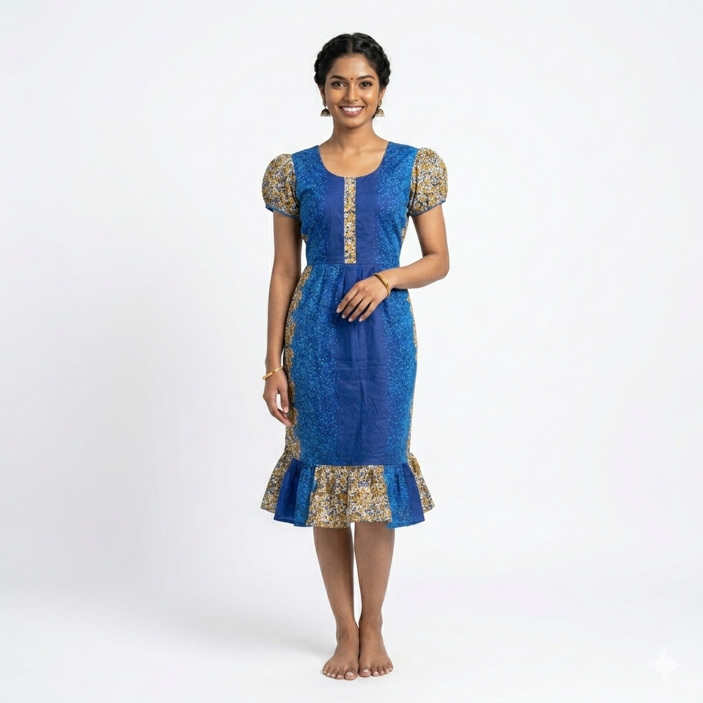 Fabric & Fit: Made from soft, breathable cotton, it boasts a frock-style silhouette with a round neckline and short sleeves, offering a relaxed yet stylish look.
