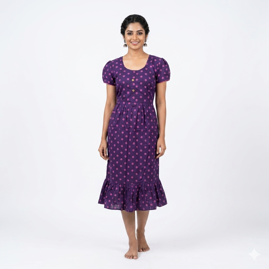 Fabric & Fit: Made from soft, breathable cotton, it boasts a frock-style silhouette with a round neckline and short sleeves, offering a relaxed yet stylish look.