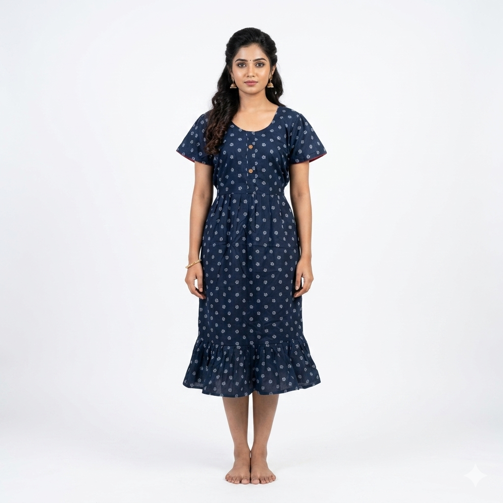 Our Knee-Length Frill Frock Nighty offers a perfect blend of style and comfort, designed for those who value elegance in their sleepwear.