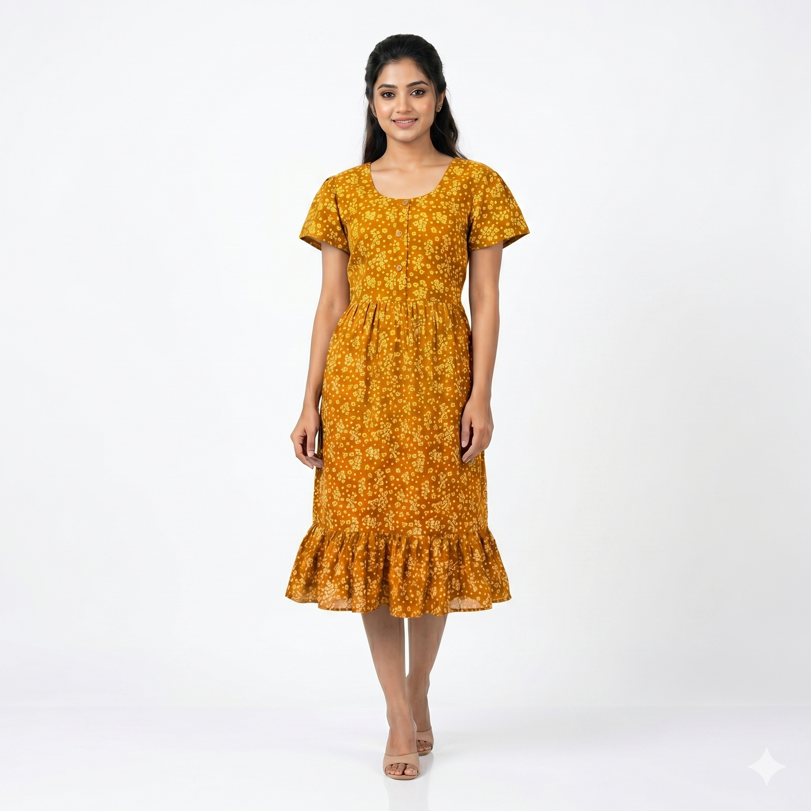Fabric & Fit: Made from soft, breathable cotton, it boasts a frock-style silhouette with a round neckline and short sleeves, offering a relaxed yet stylish look.