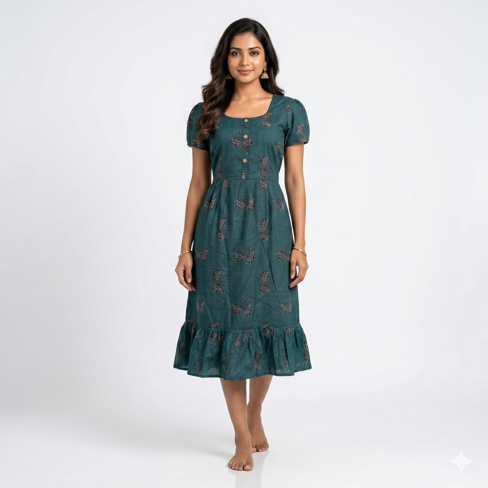 Fabric & Fit: Made from soft, breathable cotton, it boasts a frock-style silhouette with a round neckline and short sleeves, offering a relaxed yet stylish look.